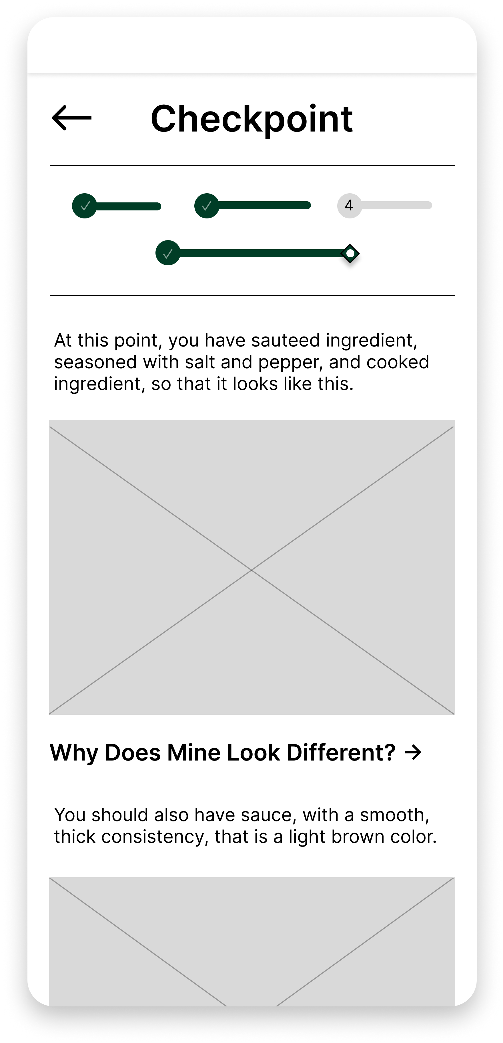 I kept these ideas in mind as I began my sketching. I generated multiple ideas, with some common features including a timeline, check in images for each step, links to information about any required techniques, and some indicator of what was upcoming.